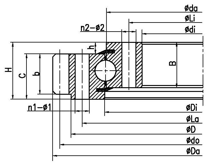 | INA 型號 | Rothe Erde 型號 | LYC 型號 | TG 型號 | 外形尺寸(mm) | 安裝尺寸(mm) | 結(jié)構(gòu)尺寸(mm) | 齒參數(shù)(mm) | 額定軸向靜負荷(KN) | 重量(KG) | | Da | D | di | H | La | Li | n1 | n2 | φ1 | φ2 | D1 | d | b | h | B | C | Di | da | m | z | do | x |